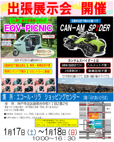 『エコール・リラ』の3階ふれあいひろばに於きまして、BRPカンナムスパイダーとEQV-PICNICの合同出張展示会を開催いたします!!